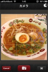 カメラをタップすると、グリッド表示されたカメラウィンドウが表示されて、食べもの写真を撮影することが出来ます。