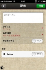 次に進んで、説明文、ジャンル、お店や場所(現在地情報検索による入力)、公開/非公開、Twitter同時投稿などを設定します。