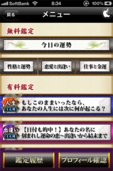 姓名判断に基づいた「今日の運勢」「一億人の順位」や、本格鑑定メニュー「性格と運勢」「恋愛と出逢い」「仕事と金運」を楽しめます。