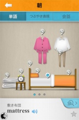朝を選択した場合は、ベッドの場面からボタンをタップすると単語が表示されて音声再生されます。