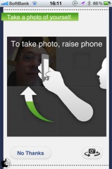 写真の撮影は、ボタンをタップすると、フロントカメラが起動し、iPhone を眼の高さ(かそれより上)まで持ち上げるように指示が出ます。