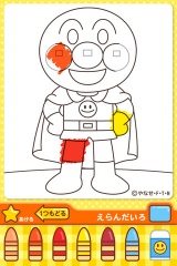 5種類の下絵でキャラクターたちに色をぬって遊べる「ぬりえ」機能が搭載されていて、フリーハンドで色を塗ることができる「じゆうにぬりえ」と、タッチすると塗りつぶされる「きれいにぬりえ」が利用出来ます。