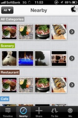 Nearbyをタップすると、現在地情報を元に近隣に投稿された情報が表示されます。