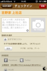 ログイン後、他のグルメSNS系と同じくチェックインをタップし、お店情報の投稿を行います。