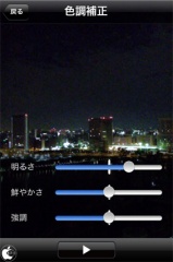 色調補正では、明るさ、鮮やかさ、強調のスライダーを動かす事で、微調整を行う事が出来ます。