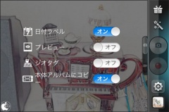 調整ボタンをタップすると、日付ラベル、プレビュー、ジオタグ、本体アルバムコピーなどのオン/オフを行う事が出来ます。
