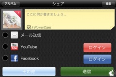 アクションボタンをタップすると共有画面が表示され、メール送信、Facebook、YouTubeなどへ投稿することが出来るようになっています。