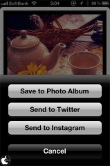 編集後は写真ライブラリー保存に加えて、Twitter投稿、Instagram転送などが行えるようになっています。