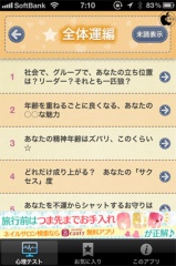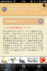 2012年04月29日(日) iPhone App Store#iPhone#iPod_touch#心理テスト かんたん心理テストアプリ「心理テスト」を試す ※本サイトは、アフィリエイト広告および広告による収益を得て運営しています。購入により売上の一部が本サイトに還元されることがあります。 心理テスト AppBankが、iPhone/iPod touch用心理テストアプリ「心理テスト」を、App Storeにて無料配布を開始していたので試してみました。 恋愛、生活、金運、美容、全体運に関する深層心理を知る事が出来るアプリです。 知りたいジャンルをタップすると、具体的に知りたい項目がリスト表示されます。 項目をタップすると、項目に関する質問が表示され、回答として4択の中から選びます。 その選んだ内容によって深層心理分析結果を読む事が出来ます。 その他の4択を選んだ場合の解析結果も表示され、その違いを知る事で、深層心理をより詳しく知る事が出来るようになっています。 ↓の評価ボタンを押してランキングをチェック!