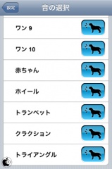 設定を押すと、犬の鳴き声が10種類、赤ちゃん、ホイール、トランペット、クラクション、トライアングルなど、犬の鳴き声以外の音も入っています。