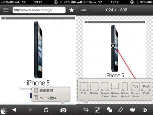キャプチャしたいサイトを表示して、カメラボタンをタップすると、表示されている範囲を撮影するモードと、スクロールして表示されるサイト全体をキャプチャーするモードが選択出来ます。