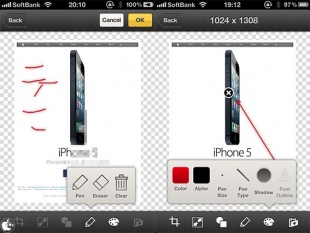 図形アイコンをタップすると画像上に四角や丸の囲みを配置したり、矢印を書いたり出来ます。