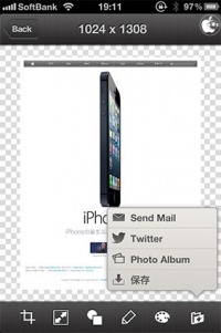 保存ボタンをタップすると、メール添付、Twitter投稿、カメラロール保存の他に、アプリ内に保存することが出来ます。