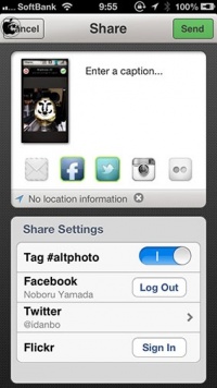 画面中央下の共有ボタンをタップすると、 Instagram転送、Facebook、Twitter、Flickr投稿、メール添付を同時に行う事が出来るようになっています。
