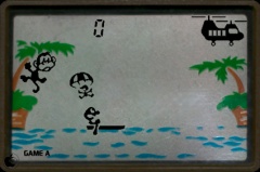 ゲームの内容は、ヘリコプターから落下するパラシュート部隊を、手漕ぎボートで救出するゲームです。救出に失敗すると、サメに食べられてしまいます。