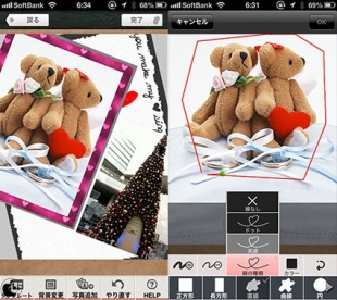 テンプレートを選択せず、最初に写真追加をタップすると、自由変形や型抜きによる写真の切り抜きが行えます。