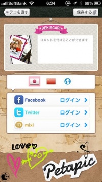 完成した写真は、Facebook、Twitter、mixiなどにコメント付きで投稿することが出来ます。