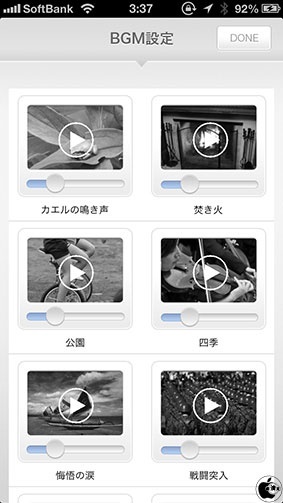 SET THE BGMをタップすると、カエルの鳴き声や焚き火の音といったリラックスサウンドなどが表示され、バイノーラル・ビートとは別に、リラックスサウンドを再生することも出来ます。