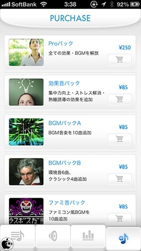 右下の音符ボタンをタップすると、Proパック、効果音パックなど、アプリ内課金を利用してサウンドを追加することが出来ます。