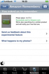 Amazonは、iPhone/iPod touchレイアウトに対応したサイトを用意していますが、このアプリ版は、iPhone 3Gのカメラで撮影した画像を元に、Amazon内の該当する商品を探してくれる機能を持っています。