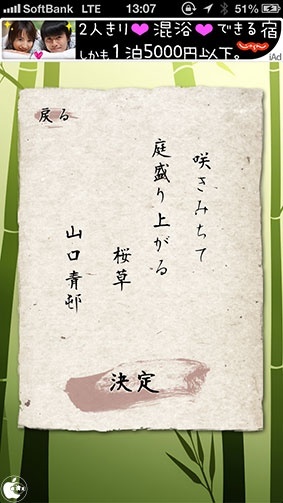 2013年03月26日(火) iPhone App Store#iPhone#iPod_touch#Twitter Twitterに縦書きで俳句をツイートできるアプリ「俳句ったー」を試す ※本サイトは、アフィリエイト広告および広告による収益を得て運営しています。購入により売上の一部が本サイトに還元されることがあります。 俳句ったー Y2が、iPhone/iPod touch用ツイート専用アプリ「俳句ったー」を、App Storeにて無料配布を開始していたので試してみました。 Twitterに縦書きで俳句をツイートできるアプリです。 五、七、五の行に俳句文を、作の行に作者名を入力します。 字余りや字足らずにも対応し、計140文字に収まれば何文字でも構いません。 プレビューで確認後、決定をタップすると、そのままのレイアウトでTwitterにツイートすることが出来ます。 設定のデフォルトではハッシュタグ付きですが、外すことも出来ます。