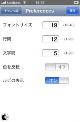 2008年12月05日(金) iPhone App Store#iPhone_3G#iPod_touch#ポケット青空文庫 ルビ表示対応青空文庫ビュワーアプリ「ポケット青空文庫」を試す ※本サイトは、アフィリエイト広告および広告による収益を得て運営しています。購入により売上の一部が本サイトに還元されることがあります。 ポケット青空文庫 aillが、iPhone/iPod touch用青空文庫ビュワーアプリ「ポケット青空文庫」を、App Storeにて販売を開始していたので試してみました。 青空文庫に収録されている7675作品(2008年12月時点)のうち、作家501名、作品7477点に対応しているそうです。 アプリから、好きな作品を直接ダウンロードします。 小説の表示は、フリックすることでページを送ることが出来ます。 文庫を表示している時に、画面の最上部分あたりをタップすると設定ボタンが表示されます。 設定では、フォントサイズ、行間、文字間、色を反転、ルビの表示 などの項目が用意されています。 ↓の評価ボタンを押してランキングをチェック!