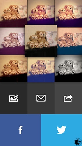 画面上部をタップするとカメラロールが表示され、写真をタップすると8つのフィルターが掛かったプレビューが表示されます。