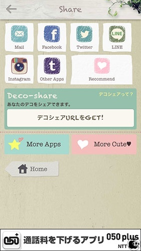 Deco-shareからURLを取得し、そのURLをメールや、Facebook、Twitterなどで共有すると、自分が作成したデコレーションパターンを他の人も利用することが出来るようになります。