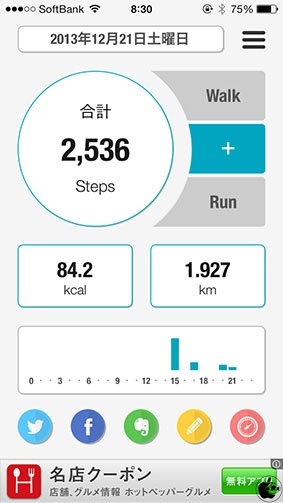 Twitter、Facebook、Evernoteへの投稿も可能な、iPhone 5s用M7モーションコプロセッサ対応歩数計アプリ「Walker - 歩数計 M7」を試す