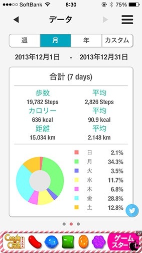 期間別データ表示では、週別、月別、年別の歩行データや、曜日別の歩数など、詳細なデータを確認することが出来ます。