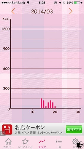 消費カロリーや歩数のデータは、毎日午前0:00からの累積が表示され、1ヶ月単位で消費カロリーの推移が一目でわかるグラフ表示や、1日ごとに消費カロリーを並べて表示する一覧も見る事が出来ます。