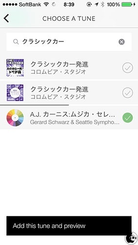 写真の編集が終わると、次にiTunes上にある楽曲の中から、一緒に投稿したい楽曲を検索で探します。