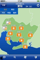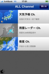 Chアイコンをタップすると、天気予報チャンネル以外に、雨雲レーダーチャンネル、衛星チャンネルに切換える事ができます。