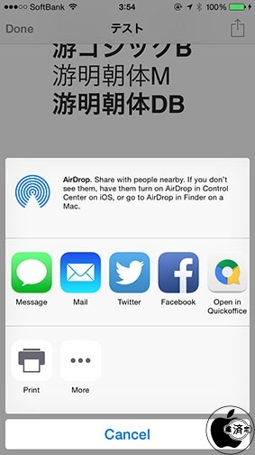 このファイルビューワ表示画面は、iOS 8のシステムが持っている機能ですが、それだけを抜き出し、プレビュー表示と共有機能を利用可能にしています。