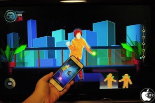 iPhoneを右手に持ち、Apple TVに映し出される動きに合わせてダンスします。