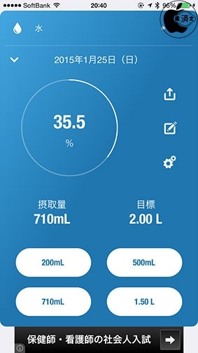 任意の水分量は、4つのボタンの中から一つをタップし、ボトル表示を上下させて量を調整後追加することが出来ます。