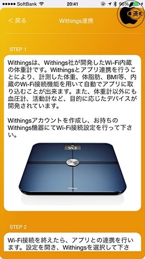 体重は、手動入力の他に、Wi-Fi体重計「Withings Smart Body Analyzer」と連動可能で、血圧は、手動入力の他に、Bluetooth血圧計「Wireless Blood Pressure Monitor」と連動することが可能となっています。