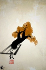琴の音色に合わせて、カラー彩色された水墨画の盆栽が育ちながら花を咲かせます。