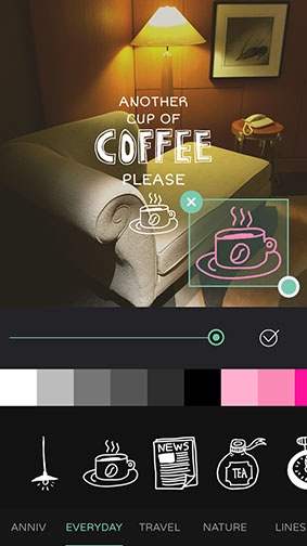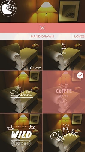 テンプレートは7つのカテゴリ(フリーハンドアート・恋愛&記念日・タイポグラフィ・インスピレーション・旅行・フレーム・レイアウト)でカスタマイズのパターンは無限です。