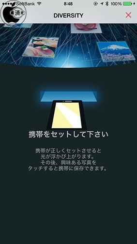 滝壺にiPhoneをセットすると自分のエリアが青く発光し、滝を流れる画像の中から興味のある画像にタッチすると、その画像が体験者の目の前に移動し、アプリ内に蓄積されます。