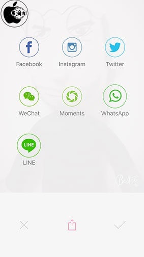 共有ボタンをタップすると、Facebook、Instagram、Twitter、WeChat、Moments、WhatsApp、LINEに投稿することが可能となっています。