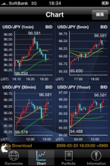 Chartをタップすると、1分足から月足まで選択可能なローソク足チャートが4つまで同時に表示することが出来ます。