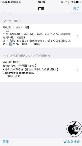 辞書をタップすると、Apple用用語辞典に加え、iOS 6以降から内蔵されている三省堂の「スーパー大辞林」「ウィズダム英和辞典」「ウィズダム和英辞典」辞書を使って検索することができます。