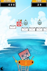 アプリ自体は、Flash Lite 2.0用のサンプルゲーム「箱坊TempMe!」を進化させたもののようで、タイミングよく箱坊を飛ばし、画面を横切るメールにうまく添付すると得点が加算されます。