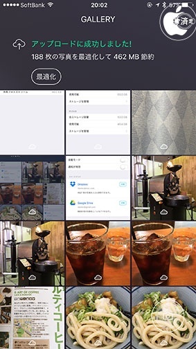 188枚のオリジナル写真をアップロードし、ローカルストレージ内に、高圧縮のJPEGファイルを残す最適化が行われた結果462MBのストレージ容量を節約することが出来ました。