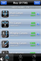こうしたスクロールシューティングの場合、途中でパワーアイテムが出現すると思うのですが、このアプリは、レベルを進めるにつれて貯まってゆくコインでパワーアイテムを購入するという手法が取り入れられています。