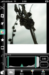 カラーアイコンをタップすると、写真のレベルが表示され、自動調整ボタンをタップしてレベルの自動補正を行なうことが出来ます。