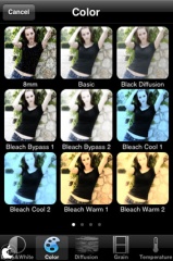 最初に効果の種類「Black & White」(白黒)「Color」(カラー 70種類)「Diffusion」(テクスチャー 50種類)「Grain」(映画フィルム 27種類)「Temperature」(色温度 18種類)の中から求める効果を選択します。