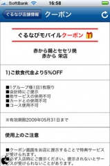 従来、iPhone OSのSafariからぐるなび検索を使用した場合、PCレイアウトモードになってしまうため、印刷しないと使用出来ないクーポンが表示されてしまいましたが、iPhoneアプリ化されたことで、携帯電話用のぐるなびモバイルと同様に表示して見せるだけで特典が受けられるクーポンが表示されるようになっています。