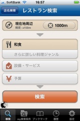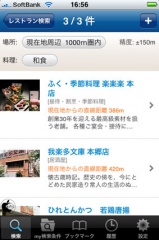 検索された結果は、現在地からの距離情報を変更したり、ジャンルの絞り込みによる再検索を行なう事も出来ます。